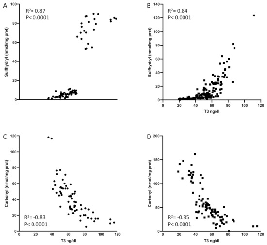 Interestingly, we observed an inverse correlation between carbonyl levels (oxidized proteins) and T3 levels in septic patients (R2 = 0.59, p < 0.0001; Figure 1C) as well as in septic shock (R2 = 0.66, p < 0.0001; Figure 1D). These results thus confirmed the importance of circulating reducing thiol groups to maintain normal levels of GSH and T3 in disease, as shown before [21]. Figure 1 displays patients with sepsis or septic shock and low T3 syndrome (T3 lower than 60 ng/dL) and patients with sepsis or septic shock and a higher or normal levels of T3, all those that composed the cohort of ICU patients described in this manuscript. This explains the two clusters we might have in the graphs.