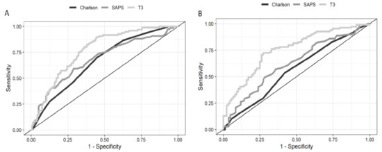 Patients who presented with NTIS at ICU admission revealed higher mortality than those with normal TH levels (41.3% p < 0.001, Table 1). Patients with low T3 and T4 levels had worse outcomes compared with those with only low T3 levels (mortality of 55% vs. 30%, p < 0.001). There were significant differences between survivors and non-survivors in the univariate analysis for the following variables: age; serum lactate levels; C-reactive protein levels; T3, T4, and fT4 levels; SAPS III; SOFA score; and Charlson Comorbidity Index. Lower levels of T3 yielded an independent AUC of 0.76 (Figure 3A). The AUC for SAPS III and the Charlson Comorbidity Index was 0.68 (95% CI, 0.60–0.76) and 0.67 (95% CI, 0.59–0.74), respectively. The cutoff value of 60 pg/mL for T3 levels displayed a sensitivity of 81% and specificity of 64% for predicting death, with an OR of 4.89 (95% CI, 2.48–9.66).