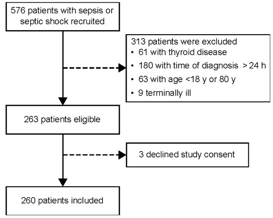 This prospective cohort study was performed between October 2017 and April 2019 and recruited 576 consecutive adults admitted to the ICU of a tertiary hospital in southern Brazil. Patients diagnosed with sepsis or septic shock within 24 h of evolution were eligible for the study. Sepsis was defined as organ dysfunction (an increase in the SOFA score by ≥2 points) caused by a dysregulated host response to infection. Septic shock was defined as a subset of sepsis characterized by profound circulatory, cellular, and metabolic abnormalities, clinically identified by vasopressor requirement to maintain a mean arterial pressure ≥65 mmHg, and serum lactate level >2 mmol/L (>18 mg/dL) in the absence of hypovolemia [39]. Low T3 referred to levels under the normal range, concomitant with normal/low-normal TSH serum levels [40]. The exclusion criteria were as follows: (1) age <18 years or >80 years; (2) a history of primary thyroid disease; (3) pregnancy or immediate postpartum period; and/or (4) imminent death or the directive of exclusive palliative care [30,32]. Based on the prevalence of NTIS and local mortality for patients with septic shock, we calculated the sample size to provide a statistical power of 90% for determining an absolute difference of 20% in the mortality between the two groups (assuming a two-sided level) using Epitools Epidemiological Calculators [41]. Accordingly, 260 patients were enrolled (Figure 4).