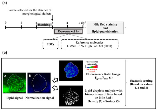 In this context, the in vivo zebrafish larva model offers numerous advantages: complexity and variety of cell and organ interactions compared to in vitro models [20,21,22,23]; small size, transparency, rapid development (the liver is functional 3 days post-fertilization, dpf [22]); liver similarities to human with regard to functions and sensitivity towards xenobiotics (metabolism, toxicity, cellular and molecular responses) [21,24,25,26,27,28,29]; endocrine system similarities to human (nuclear/metabolic receptors mediating EDC effects and endocrine disruption) [30]. Concerning NAFLD and TAFLD, it has been shown that zebrafish can, in response to environmental triggers, develop hepatic steatosis [26,31,32,33,34] or transition from steatosis to steatohepatitis [35,36]. Moreover, in recent years, the zebrafish model at the embryonic and larval stages has become one of the most popular vertebrate models used for high-throughput drug screening and for studying lipid metabolism disorders and related diseases including NAFLD [34,37,38,39], notably in relation with EDCs (e.g., tributyltin [40,41]; perfluorooctane sulfonate [33]). Furthermore, according to the current European Union Animal Welfare Regulation (EU 2010), zebrafish younger than 5 days post-fertilization is not regulated by animal welfare legislation [42], and is thus considered an alternative model to animal experimentation. Based on all those properties, the zebrafish larva model is therefore an easily accessible, alternative experimental model for the in vivo screening of EDCs for their potential involvement in the development of liver steatosis and its transition to steatohepatitis.