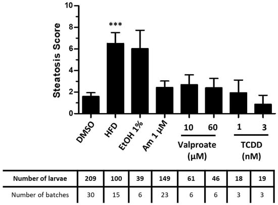 Screening of the steatogenic molecules with the StAZ bioassay. Zebrafish larvae at 3 dpf were exposed to selected steatogenic controls: high-fat diet (HFD), ethanol 1% v/v (EtOH 1%), amiodarone (1 µM), valproate (10/60 µM) or TCDD (1/3 nM). Following exposure, larvae were euthanized and fixed, and steatosis score (cf. Figure 1b) was calculated based on Nile red staining and image-based automated analysis after confocal microscopy acquisition. Values are mean +/− SEM, with the number of batches and larvae indicated in the table underneath the graph. *** p < 0.001, by comparison with control group using Kruskal–Wallis test.