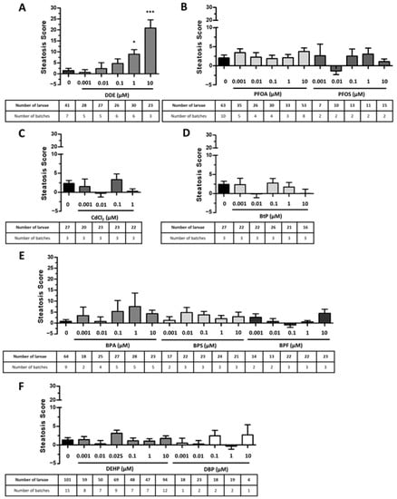 Screening of endocrine disruptors with the Steatogenic Assay on Zebrafish. Zebrafish larvae at 3 days post-fertilization were exposed to the selected compounds at non-toxic concentrations: DDE (A), perfluorinated compounds (B), cadmium (C), butyl-paraben (D), bisphenols (E), phthalates (F) or to vehicle alone, during 48 h. Following exposure, larvae were euthanized and fixed, and steatosis scores (based on lipid fluorescence intensity, lipid droplet density and area in the liver) were calculated based on Nile red staining and image-based automated analysis after confocal microscopy acquisition. Values are mean +/− SEM; with the number of batches and larvae indicated in the table underneath the graph. * p < 0.05, *** p < 0.001 by comparison with control group using Kruskal–Wallis test.