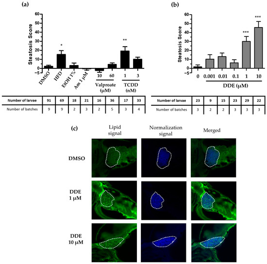 Screening of the steatogenic molecules and validation of the steatogenic effect with the StAZ using the transgenic zebrafish model. Zebrafish transgenic larvae at 3 days post-fertilization were exposed to positive control steatogenic conditions (HFD, ethanol, amiodarone, valproate, TCDD) (a), to DDE at concentrations ranging from 0.001 to 10 µM (b), or to vehicle alone (a,b), during 48 h. Following exposure, larvae were euthanized and fixed, and steatosis scores (based on lipid fluorescence intensity, lipid droplet density, and area in the liver) were calculated based on Nile red (NR) staining and image-based automated analysis after confocal microscopy acquisition. Values are mean +/− SEM, with the number of batches and larvae indicated in the table underneath the graph. * p < 0.05, ** p < 0.01, *** p < 0.001, by comparison with control group using Kruskal–Wallis test. (c): Confocal microscopy images obtained after DDE (1/10 µM) or vehicle control exposure and Nile red staining showing lipid droplets stained in green. The liver is delimited by the dotted lines.