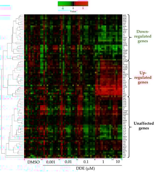 In order to determine how DDE induced excessive hepatic lipid accumulation, we performed a large scale RT-qPCR gene expression analysis by using the microfluidic Fluidigm-Biomark technology, which allows to carry out 9216 PCR reactions in parallel (96 samples × 96 assays) [96]. In addition to genes involved in lipid homeostasis, genes related to liver toxicity and oxidative stress, and nuclear receptors were investigated because of their involvement in NAFLD. As seen on the heatmap, most of the changes induced by DDE occurred at doses of 1 and 10 µM, which was coherent with the effects observed on steatosis (Figure 5).