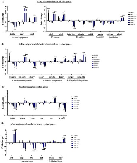 To get insight into the underlying mechanisms of DDE’s steatogenic properties, the expression of a set of 89 genes (Figure 5 and Figure 6) was analyzed upon DDE exposure. In coherence with results on steatosis, the built heatmap (Figure 5) clearly showed an effect of DDE exposure at the concentrations of 1 and 10 µM. Focusing on the genes related to fatty acid metabolism (Figure 6a), the steatogenic effects of DDE were consistent with the up-regulation of perilipin 1 and 3, which are key structural proteins of lipid droplets [106]. Regarding the potential mechanisms of the accumulation of fatty acids into lipid droplets, the strongest positive impact of DDE exposure was on de novo lipogenesis-related genes, i.e., me1 and scd1 (Figure 6a). Malic enzyme me1 is particularly interesting, given that this enzyme is involved in fatty acid and cholesterol biosynthesis by generating a required co-factor, NADPH [107]. In addition, an association between increased ME1 gene expression and liver lipid accumulation has already been observed in different steatosis models, notably following high-fructose diet in mice [107,108]. Thus, we could hypothesize that the induction of me1 by DDE participates in the liver lipid accumulation. This remains to be tested. Some genes usually involved in steatosis have been described to have decreased expression in our study. For example, the expression of genes encoding FA transporters (fabp10a, fabp11b and cd36) are decreased in our study, which may be paradoxical but considered as a compensatory mechanism to limit the entry of FA into the cell and prevent their accumulation. Similarly, the expression of dgat1, known to catalyse the final step of TG synthesis for storage in lipid droplets, is reduced by DDE. However, several isoforms of dgats exist and it is worth noting that compensation might exist between the different isoforms of dgats [109].