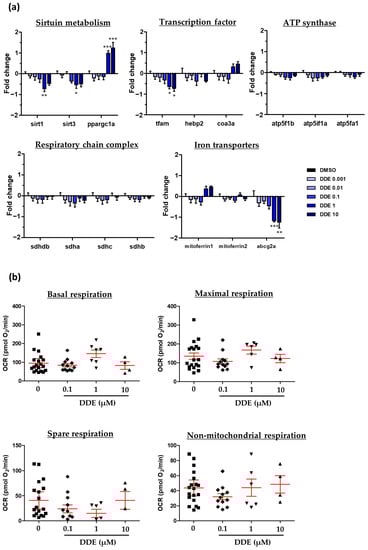 Due to the well-recognized role of mitochondrial dysfunction in NAFLD [97], and based upon our gene expression results suggesting both a decrease in β-oxidation and potential oxidative stress, we examined the expression of genes implicated in mitochondria metabolism (Figure 7a). Our results showed only slight changes in mitochondria-related gene expression (genes related to ATP synthase or respiratory chain complex). Nevertheless, a down-regulation could be observed upon DDE 1 µM of sirtuin genes (sirtuin deacetylase 1 and 3), known to be implicated in the regulation of mitochondrial activity and cellular redox control. We also found increased expression of the pparγ coactivator-1α (ppargc1α), an inducible transcriptional coactivator involved in the regulation of energy metabolism and mitochondrial biogenesis. Finally, a down-regulation of abcg2a expression (a known mitochondrial transporter of metabolites) was also detected.