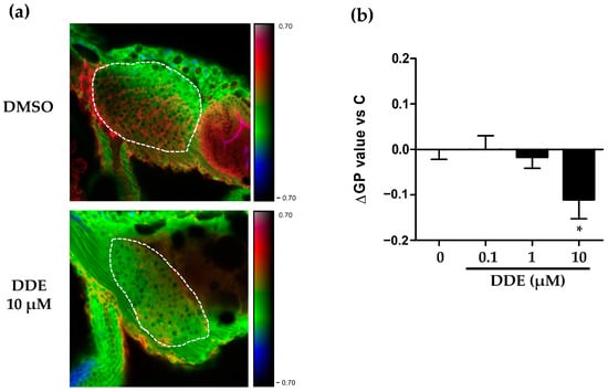DDE exposure-induced membrane remodeling in the liver of zebrafish larvae. Membrane order characteristic of membrane remodeling was assessed in liver of zebrafish larvae at 3 dpf after exposure for 48 h to DDE (0.1/1/10 µM) or to control vehicle. Zebrafish larvae were stained with di-4-ANEPPDHQ—a membrane order-sensitive fluorescent probe—and analyzed by confocal fluorescence microscopy. Membrane order in membranes of zebrafish liver was measured by computing the generalized polarization (GP) factor. (a) Representative liver images of control vehicle (DMSO) and DDE (10 µM) treatment (magnification ×400). The liver is delimited by the dotted lines. (b) Changes in GP values (ΔGP) were expressed as the difference between individual larva GP value and the mean GP calculated in control larvae (DMSO). Values are the mean ± standard error of the mean (SEM) of at least 20 larvae. * p < 0.05 by comparison with the control group using ANOVA and Dunnett’s test.