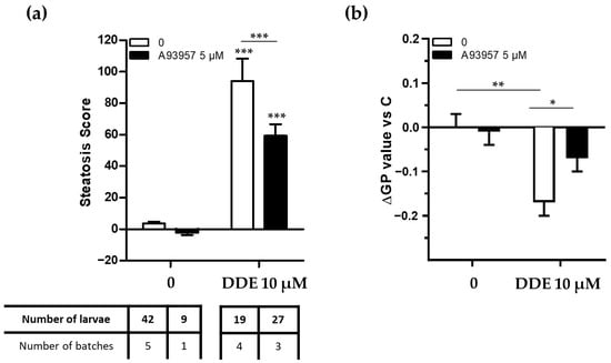 SCD1 inhibition decreases hepatic lipid accumulation and membrane remodeling after exposure to DDE. Zebrafish transgenic larvae at 3 days post-fertilization were co-exposed to a specific SCD1 inhibitor (A939572 5 µM) and to DDE (10 µM) during 48 h. (a) For the steatosis score evaluation, larvae were euthanized following exposure and fixed, and steatosis scores (based on lipid fluorescence intensity, lipid droplet density, and area in the liver) were calculated based on Nile red staining and image-based automated analysis after confocal microscopy acquisition. Values are mean +/− SEM; with the number of batches and larvae indicated in the table underneath the graph *** p < 0.001, by comparison with control group using two-way ANOVA and Bonferroni tests. (b) Membrane order was assessed in liver cells of zebrafish larvae after staining with di-4-ANEPPDHQ—a membrane order-sensitive fluorescent probe—and analyzed by confocal fluorescence microscopy. Membrane order in membranes of zebrafish liver was measured by computing the generalized polarization (GP) factor. Changes in GP values (ΔGP) were expressed as the difference between individual larva GP value and the mean GP measured in control larvae (DMSO). Values are mean +/− SEM for n ≥ 3 batches per conditions. * p < 0.05, ** p < 0.01, by comparison with all groups using ANOVA and Newman–Keuls test.