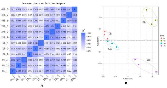 Correlation analysis and principal component analysis (PCA): (A) sample correlation analysis; (B) sample distributions in PCA 1 and PCA 2.