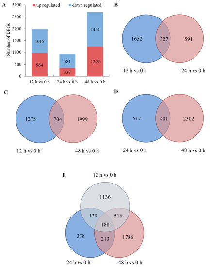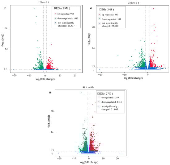 Differentially expressed genes (DEGs): (A) numbers of DEGs in each time node; (B) Venn diagrams for 12 h vs. 0 h and 24 h vs. 0 h; (C) Venn diagrams for 12 h vs. 0 h and 48 h vs. 0 h; (D) Venn diagrams for 24 h vs. 0 h and 48 h vs. 0 h; (E) Venn diagrams for 12 h vs. 0 h and 24 h vs. 0 h and 48 h vs. 0 h; (F) volcano plots for 12 h vs. 0 h; (G) volcano plots for 24 h vs. 0 h; (H) volcano plots for 48 h vs. 0 h.