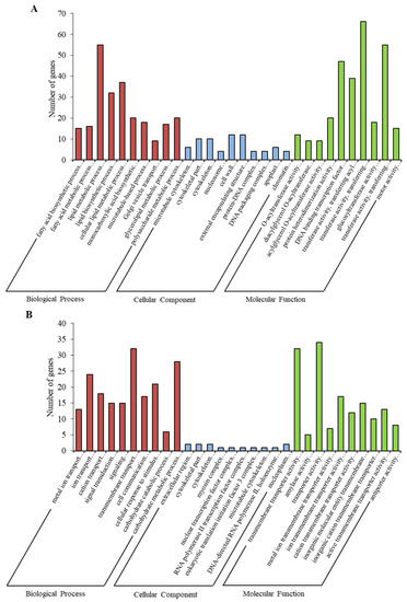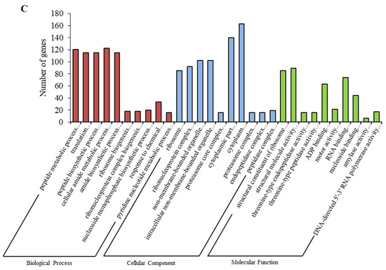 Based on the screening condition of p value ≤ 0.05, a total of 8355 genes were annotated as significantly enriched. Fatty acid biosynthetic process, microtubule cytoskeleton and O-acyltransferase activity were the main items that were enriched after 12 h (Figure 4A and Figure S1). Metal ion transport, extracellular region and transmembrane transporter activities were the main items that were enriched after 24 h (Figure 4B and Figure S2). Peptide metabolic process, ribosome and structural constituent of ribosome were the main items that were enriched after 48 h (Figure 4C and Figure S3).