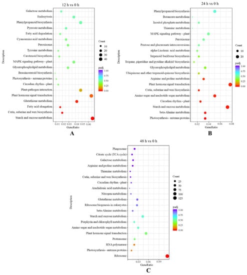 Kyoto Encyclopedia of Genes and Genomes (KEGG) enrichment analysis in the following groups: (A) 12 h vs. 0 h; (B) 24 h vs. 0 h; (C) 48 h vs. 0 h.