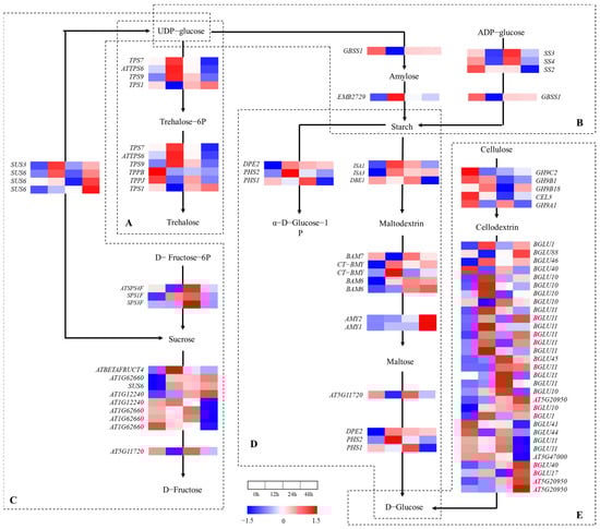 Heat map of annotated genes in starch and sucrose metabolism pathway. Solid lines and arrows represent biological processes and directions, while areas separated by dotted lines represent different types of biological processes. (A) Trehalose synthesis process; (B) starch synthesis process; (C) sucrose synthesis and hydrolysis process; (D) starch hydrolysis process; (E) cellulose hydrolysis process.