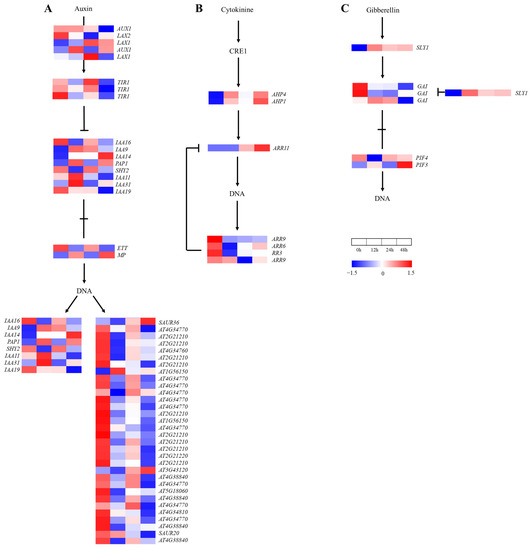 A total of 87 genes were annotated in the plant hormone signal transduction pathways (Figure 7). In the IAA, CK and GA signaling pathways, 50, 7 and 6 genes were found, respectively. The expressions of 37 genes decreased at 12 h and then increased at 24 h in the IAA signaling pathway (Figure 7A), of which 19 genes (TIR1, IAA16, SHY2, ETT, At2G21210, AT4G34760, AT4G34770, AT1G56150, AT3G43120, AT5G18060 and AT4G38840) and 15 genes (LAX2, LAX1, TIR1, IAA19, AT4G34770, AT2G21210, AT2G21220 and AT4G38840) reached the lowest values at 12 h and 48 h, respectively. The expressions of four genes (ARR6, ARR9 and RR3) in the CK signaling pathway (Figure 7B) decreased at 12–24 h, with a small increase at 48 h. Induced by the salt treatment, the genes’ expressions in the GA signal transduction pathway (Figure 7C) changed in a complicated manner; the expressions of two DELLAs (GAI) maintained a level lower than that at 0 h after 12 h of downregulation. Thus, IAA, CK and GA signaling were inhibited by the salt treatment.