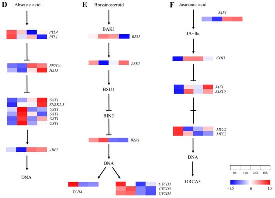 Heat map of annotated genes in plant hormone signal transduction pathway. Solid lines and arrows indicate the signal transduction process and direction. (A) Indole-3-acetic acid (IAA) signaling pathway; (B) cytokinin (CK) signaling pathway; (C) gibberellin (GA) signaling pathway; (D) abscisic acid (ABA) signaling pathway; (E) brassinolide (BR) signaling pathway; (F) jasmonic acid (JA) signaling pathway.