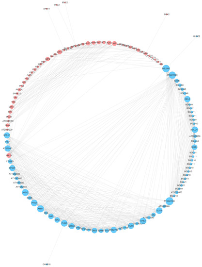 Protein–protein interaction (PPI) network among the starch and sucrose metabolism pathway and the plant hormone signal transduction pathway. The blue and red nodes represent the sucrose metabolism pathway and the plant hormone signal transduction pathway, respectively. The diameters of the nodes represent the interaction frequency.