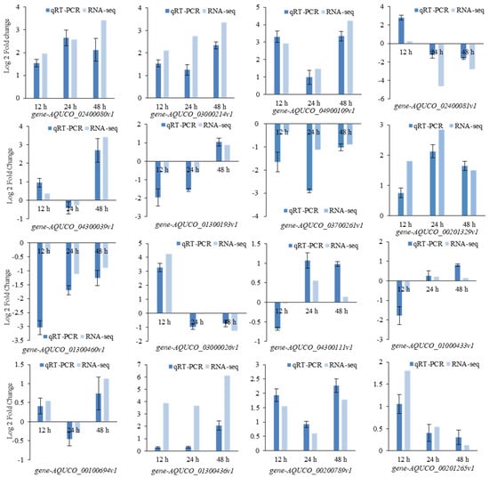 In order to verify the reliability of the RNA-seq, the relative expressions and log 2-fold changes of 16 genes were calculated based on Ct. The upregulation or downregulation trends in the quantitative real-time PCR (qRT-PCR) were the same as those in the RNA-seq (Figure 9), which indicates the considerable reliability of the RNA-seq.