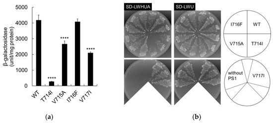 Cleavage activities in the APP FAD mutant were evaluated in the yeast system. β-galactosidase activity determined the degree of APP mutant cleavage quantitatively. The β-galactosidase activity of I716F was comparable to that of the wild-type; however, the activities of T714I, V715A, and V717I were significantly reduced compared to the wild-type (Figure 2a). These data imply that some FAD mutations reduce ε-cleavage of APP. Among these mutants, T714I displayed the greatest reduction in cleavage (Figure 2a). In media lacking histidine and adenine (SD-LWHUA), T714I showed reduced growth after three days of incubation, indicating the reduced cleavage. On the other hand, V715A, I716F, and V717I showed similar growth to the wild-type (Figure 2b). Similar results were obtained at two days of incubation. No effect of V715A and V717I can be seen, even though statistically significant effects on β-galactosidase activity can be seen (Figure 2a). We interpreted that the expression of the reporter genes, HIS3 and ADE2, in these mutants exceeded the threshold for full growth.