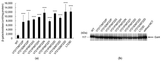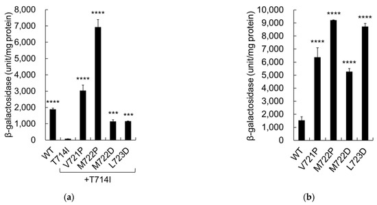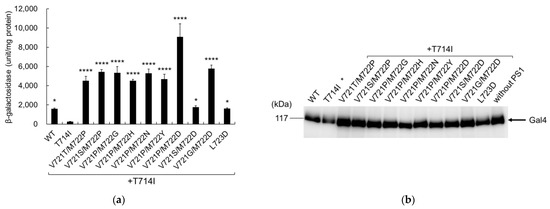 Analysis of β-galactosidase activity indicated that all secondary mutants significantly increased cleavage activity, compared to T714I (Figure 3a). The significant difference between WT and T714I changes from p < 0.0001 (Figure 2a) to p < 0.05, but this may be due to the data set with large error in V721P/M722D. Immunoblotting confirmed that the expression levels of mutant C55-Gal4p were similar to those of the wild-type cells (Figure 3b).