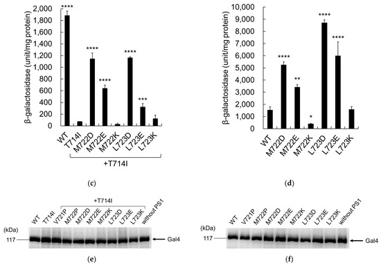Figure 5. β-Galactosidase activity of APP proline and aspartate mutants. (ad) β-Galactosidase activity was assayed for each cell expressing either WT or mutant APPC55-Gal4p, as in Figure 3. Activity was normalized to that of the control cells without PS1 (61 units/mg protein for (a,c) and 63 units/mg protein for (b,d)). Asterisks indicate p < 0.0001 (****), p < 0.001 (***), p < 0.01 (**), or p < 0.05 (*) compared to the control (T714I for (a,c) or the WT for (b,d)); (e,f) Expression of WT and mutant APP in yeast. Cell lysates were analyzed using immunoblot assays, as in Figure 3. The arrow indicates the position of Gal4.