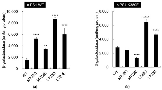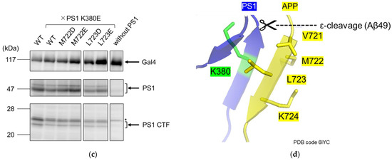 We then assessed the ability of the aspartate mutants to activate APP cleavage through ionic interactions with the γ-secretase catalytic subunit, presenilin (PS1). A recent cryo-EM study of the structure of γ-secretase-APP revealed that APP M722 and L723 formed a β-sheet structure with PS1 (Figure 6d) [22]. It has also been suggested that APP 721VML723 can fit into a large–small–large (S1′–S2′–S3′) binding pocket in PS1 [5,24]. Studies indicate that APP M722 and L723 are located near the lysine residue in PS1 K380, which is a part of the S3′ binding pocket (Figure 6d). To analyze possible interaction between the negative charge of aspartate mutation in APP M722D or L723D and positive charge of PS1 K380, PS1 K380 was mutated to glutamate (K380E) and β-galactosidase activity was measured (Figure 6a,b).