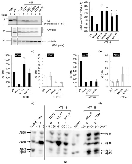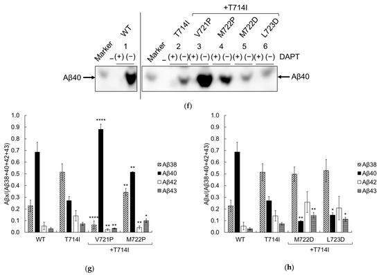 Figure 7. Aβ production in Chinese hamster ovary (CHO) cells containing APP secondary mutations and T714I. CHO cells were transfected by lipofection with WT or mutant APPC99, and an empty vector. (a) Secreted Aβ in the media and APP C99 in cell lysates were detected using 82E1. We also detected α-tubulin using a DM1A antibody; (b) The cleavage rate (Aβ/C99) was quantified form immunoblots; (c,d) Aβ secreted from the recovered media was quantified using two-site ELISA with antibodies against Aβ40 (left panel) and Aβ42 (right panel). For quantification, each value was subtracted from the vector control (349 pM for Aβ40 and 10 pM for Aβ42); (e,f) The recovered media were also assessed using urea/SDS-PAGE analysis at pH 8.45 (e) or pH8.65 (f) and secreted Aβ was detected using 82E1. Aβ38, Aβ40, Aβ42, and Aβ43 peptides (Peptide Institute, Japan) were loaded as controls. Each mutant was controlled by adding 10 µM DAPT, which is a γ-secretase inhibitor. An asterisk denotes nonspecific bands. Numbers 1–6 denotes lane numbers; (g,h) The proportions of the Aβ fragments Aβ38 (diagonal striped), Aβ40 (black), Aβ42 (white), and Aβ43 (horizontal striped) were quantified from immunoblots. All quantifications were conducted using three independent assays and are shown with standard deviations. Asterisks indicate p < 0.0001 (****), p < 0.001 (***), p < 0.01 (**), or p < 0.05 (*) compared to T714I.
