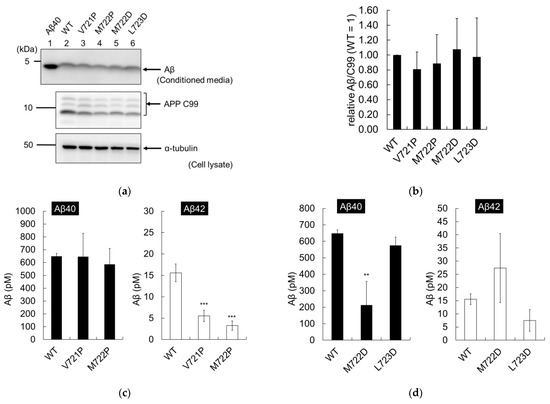 APP containing only secondary mutations was analyzed in CHO cells. Similar levels of APP C99 were detected in WT and mutant cells, with no significant changes in total Aβ production observed (Figure 8a, lanes 2–6, and Figure 8b). These results imply that secondary mutations do not affect the ε-cleavage of WT APP proteins in CHO cells. Aβ quantification by ELISA revealed that V721P and M722P reduced the amounts of Aβ42 (Figure 8c), and M722D reduced the amounts of Aβ40, compared to those of WT cells (Figure 8d). In contrast, the L723D mutant secreted similar amounts of Aβ40 and Aβ42 to those of WT cells (Figure 8d). These results imply that the trimming activity of γ-secretase is affected by APP secondary mutations alone. Therefore, it was important to analyze all secreted Aβ species, as we had done with the T714I mutant.
