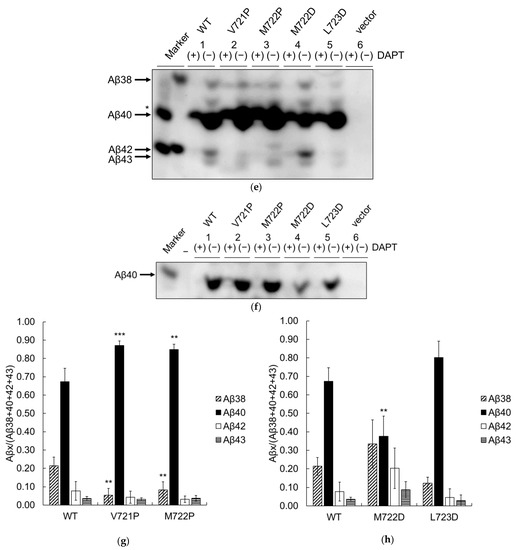 Immunoblot analysis revealed that the proportions of other Aβ species also changed. V721P and M722P caused reduced secretion of Aβ42 compared to that of WT cells (Figure 8e,f, lanes 1–3). Both proline mutations (V721P and M722P) increased the proportion of Aβ40 and decreased that of Aβ38 (Figure 8g). In summary, V721P and M722P increased the proportion of short Aβs and decreased that of long Aβs, and increased the proportion of cleavage line 1 (Table 4). In addition, a band at the Aβ41 position was observed with M722P (Figure 8e, lane 3). The effects of the proline mutations on the WT controls were similar to those observed for the T714I mutants. These results imply that proline mutations increase trimming activity with shifting the cleavage position toward Aβ40. In contrast, M722D caused increased secretion of Aβ42 and reduced the levels of Aβ40, while L723D reduced the levels of Aβ38 and Aβ42 (Figure 8e,f lanes 1, 4, and 5). M722D had a smaller proportion of Aβ40 (Figure 8h). The respective Aβ proportions of L723D were similar to those of the WT controls (Figure 8h). In summary, M722D increased long Aβs and preferred cleavage line 2; in contrast, L723D was similar to WT and preferred cleavage line 1 (Table 4). M722D appears to inhibit trimming, as observed in FAD pathology. Taken together, the results show that the proline mutations V721P and M722P modulate the cleavage of APP to lower Aβ42 levels, while the M722D mutation mimics FAD mutations.