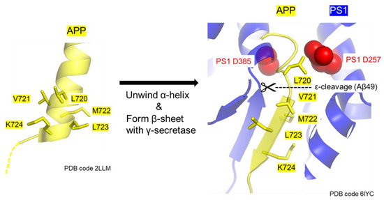 Figure 9. Structure-based models of secondary APP mutations. Structure-based models of the transmembrane domain of human APP (Protein Data Bank code 2LLM) and the transmembrane core of human APP recognized by γ-secretase (Protein Data Bank code 6IYC) are shown. These models, i.e., PS1 (blue) and APP (yellow), are indicated by a sphere containing the residues Asp257 and Asp385 (red). APP 721VMLK724 forms an α-helix that is unwound and forms a β-sheet with γ-secretase when APP is cleaved. The secondary proline mutations (V721 and M722) may facilitate this unwinding.