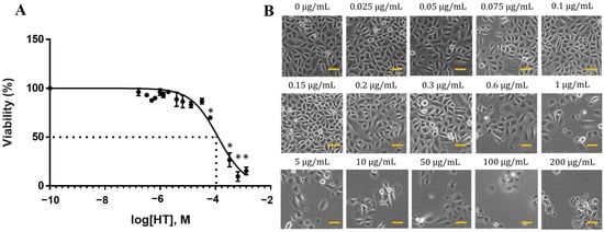 Dose-dependent effect of HT on RECs. RECs were treated with HT for 24 h, and cell viability was analyzed via MTT assay. (A) MTT assay of HT cytotoxicity. * p < 0.05: significantly different from control (0 μg/mL) (Supplementary Material Table S1). (B) Morphology of RECs treated with HT for 24 h. Scale bar represent 100 µm.