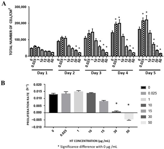 Long-term effect of HT supplementation on RECs. (A) Total number of cells attached vs. HT concentration. (B). Proliferation rate. * p < 0.05: significantly different from control (Supplementary Material Table S2).