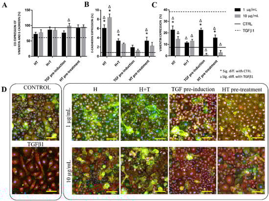 Protein expression levels of TGFβ1- and HT-treated RECs. (A) E-cadherin and vimentin co-expression levels (%) vs. control. (B) E-cadherin expression (%) vs. control. (C) Vimentin expression (%) vs. control. * p < 0.05: significantly different from control. # p < 0.05: significantly different from Group T (Supplementary Material Table S3). (D) Immunostaining of vimentin and E-cadherin expression levels at 72 h. Green cytoplasm indicates E-cadherin expression level, red indicates vimentin, and blue is DAPI-stained nuclei. Scale bar represent 100 µm.