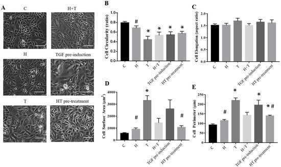 (A) REC morphology following culture in the six conditions. (B) Cell circularity. (C) Cell elongation. (D) Cell surface area. (E) Cell perimeter. * p < 0.05: significantly different from control. # p < 0.05: significantly different from Group T (Supplementary Material Table S4). Scale bar represent 100 µm.