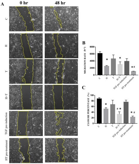 (A) Migration of RECs that had been cultured in six conditions. (B) Cell migration rate. (C) Scratch closure percentage. * p < 0.05: significantly different from control. # p < 0.05: significantly different from Group T (Supplementary Material Table S5). Scale bar represent 100 µm.