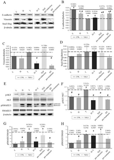 Densitometry analysis of tested protein markers to observe the effects of HT and TGFβ1 on RECs. All Western blots were performed using a conventional Western blot system except for AKT and SMAD2/3, which were analyzed with the Jess system (A–H). E-cadherin (B), Vimentin (C), Snail-Slug (D), pAKT (F), pSMAD2 (G) and pSMAD3 (H). Solid line: Untreated REC. Dashed line: TGFβ1-induced REC. * p < 0.05: significantly different from control. # p < 0.05: significantly different from Group T (Supplementary Material Table S6).