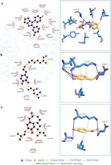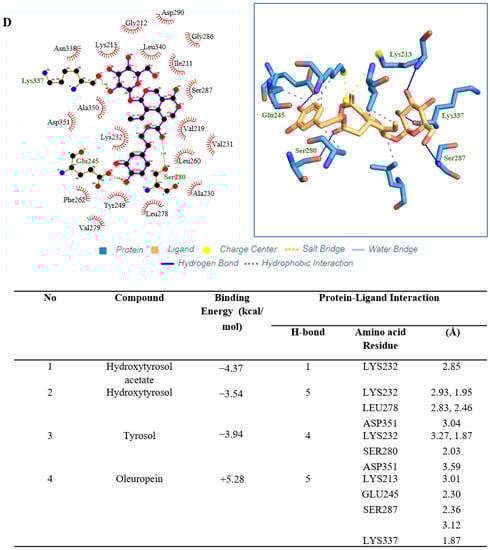 Four active compounds (HT, HT acetate, tyrosol, oleuropein) were used for molecular docking analysis to study the interaction between ligands and proteins. Among the four compounds, HT acetate had the lowest binding energy value, followed by HT, tyrosol, and oleuropein. Apart from hydrogen binding, HT acetate had the most hydrophobic interactions compared to the other compounds (ILE211, VAL219, ALA230, LYS232, TYR249, LEU260, LEU278, LEU340). However, only one hydrogen bond linked HT acetate to the amino acid LYS232 (Figure 7), while three hydrophobic interactions were recorded for HT, namely on LYS232, LYS232, and LEU260. A hydrogen bond at LYS232, LEU278, and ASP351 was observed between HT and the ALK5 receptor (Figure 7). Tyrosol interacted hydrophobically at LYS232 and LEU260 and demonstrated hydrogen binding at LYS232, SER280, and ASP351 (Figure 7). Oleuropein had the highest binding energy and had five hydrogen bonds at LYS213, GLU245, SER280, SER287, and LYS337, which bound it to the protein ALK5. In addition, there was a hydrophobic interaction between oleuropein and ALK5 at VAL219, ALA230, LYS232, LEU278, and LEU340 (Figure 7).