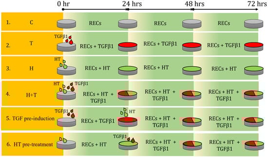 RECs at approximately 40% confluency were seeded and tested in six conditions (Figure 8): (1) untreated (C); (2) TGFβ1-supplemented (T); (3) HT-supplemented (H); (4) 72-h simultaneous supplementation of TGFβ1 and HT (H+T); (5) addition of HT after 24-h TGFβ1 supplementation and culturing in the presence of both factors for another 48-h (TGF pre-induction); (6) addition of TGFβ1 after 24-h HT supplementation and cultured in the presence of both factors for another 48 h (HT pre-treatment). The TGFβ1 concentration used in this study was 10 ng/mL.