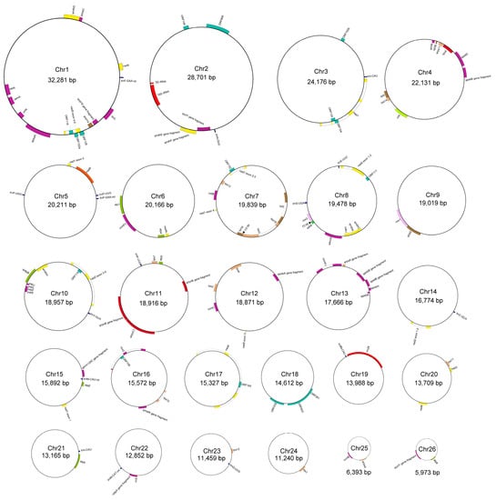The mitogenome of P. micranthum was assembled into 26 circular chromosomes with lengths ranging from 5973 bp to 32,281 bp, with a total length of 447,368 bp (Figure 1). The average GC content of the P. micranthum mitogenome was 44.4%, ranging between 40.4% and 49.2% among chromosomes (Table 1). We obtained, for most of the chromosomes, a sequencing depth above 40× for the long reads and 500× for the short reads (Table S1). Both long- and short-read assemblies were almost identical, except for Chr5 (20,211 bp), which existed as one circular sequence in the short-read sample and fragmented into Chr5A (9033 bp) and Chr5B (11,178 bp) in the long-read sample. Both minicircles were supported by 32 and 102 long reads, respectively (Figure S1). The mitogenome of P. micranthum encoded 70 genes, including 39 mitochondrial protein-coding genes, 12 plastome-derived protein-coding genes, 16 tRNA genes, and three rRNA genes (rrn5, rrn18, and rrn26) (Figure 2, Table 2). Further, 16 ORFs coding for hypothetical proteins with BLAST hits were preserved (Figure 1, Table 2 and Table S2). In addition to the copy of rrn5 on Chr2, which is identical to the one annotated in G. elata [37], the copy on Chr22 was truncated at the 5’ end (88 bp) and relatively shorter than the normal one. Each chromosome had one to four genes, whereas Chr18, with a length of 14,612 bp, was devoid of functional genes (Figure 1). Further, the “empty” sequence presented no significant similarities to the sequences in GenBank.