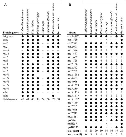 Comparison of the protein-coding gene content and group II intron content of Paphiopedilum micranthum and selected angiosperms. (A) protein-coding gene content. ● indicates present, – indicates lost; the 24 genes present in all sampled species include atp1, atp4, atp6, atp8, atp9, ccmB, ccmC, ccmFc, ccmFn, cob, cox2, cox3, matR, mttB, nad1, nad2, nad3, nad4, nad4L, nad5, nad6, nad7, nad9, and rps12. (B) group II intron content. ● indicates cis-spliced intron present, – intron lost, θ trans-spliced intron present, × intron loss due to gene loss.