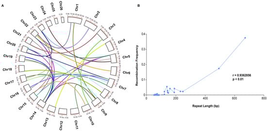 Overall, 27 tandem repeats, with lengths ranging from 27 bp to 308 bp, accounted for 1948 bp of the P. micranthum mitogenome; these repeats resided in the non-coding regions of the genome, except for a 48 bp repeat in rrn26, and some of the tandem repeats overlapped with the dispersed repeats. The mitogenome of P. micranthum possessed 89 dispersed repeats (34 types), ranging from 51 bp to 672 bp, with two to four copies and covering 9996 bp (2%) of the genome. The majority of these repeats (87 of 89, 97.7%) were intermediate-sized repeats (50 to 500 bp) and two repeats (672 bp) were large repeats (>500 bp) (Table S5), with most of these repeats residing in the noncoding regions. These repeats were distributed in 23 of the 26 chromosomes; Chr12, Chr25, and Chr26 did not contain dispersed repeats (Figure 4A). We found 16 pairs of repeats involved in the recombination of the mitogenome structure. The alternative conformations were supported by the long reads, and repeat length was positively correlated with the recombination frequency (r = 0.9379, p < 0.001), e.g., the recombination frequency of the longest repeat (672 bp) was 0.38; 116 long reads supported the alternative conformations, and 193 long reads supported the master circle conformation, while homologous recombination occurred sporadically among repeats shorter than 300 bp (Figure 4B, Table S5).