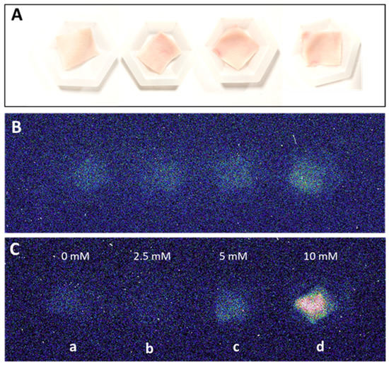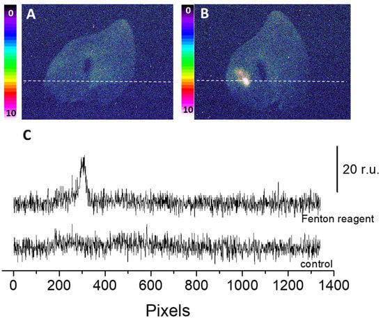 The two-dimensional image of the ultra-weak photon emission was measured spontaneously from the porcine ears and after the topical application of the Fenton reagent in the setup shown and described in detail in Section 3. Variable concentrations of H2O2 (0, 2.5 mM, 5 mM, and 10 mM) and FeSO4 were topically applied to the skin biopsies and the corresponding ultra-weak photon emission images were captured (Figure 1). The upper panel (Figure 1A) shows the photographs of the prepared skin biopsies; Figure 1B shows the spontaneous ultra-weak photon emission images to demonstrate any variability in the spontaneous ultra-weak photon emission; Figure 1C shows the dependence of the ultra-weak photon emission with the increasing concentration of Fenton reagent. It is obvious that with the increasing concentration of oxidants, there is a corresponding increase in the intensity of the ultra-weak photon emission. Following the optimization, we further carried out our study on ex vivo porcine ear, where the treatment condition was limited to 10 mM H2O2/250 µM FeSO4 (Figure 2). Figure 2A (left panel) shows an image of the ultra-weak photon emission from an ex vivo porcine ear without any stimulation/induction of oxidative stress. In Figure 2B, the ultra-weak photon emission image was measured following the treatment with the Fenton reagent. Figure 2C shows the photon intensity at the pixels marked on the images by white dotted lines. As apparent from the intensity of the ultra-weak photon emission, the skin not treated with Fenton reagent (control) shows no enhancement, whereas the skin treated with Fenton reagent shows a maximum intensity of ~25 counts/pixel.