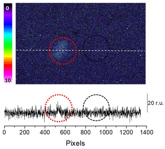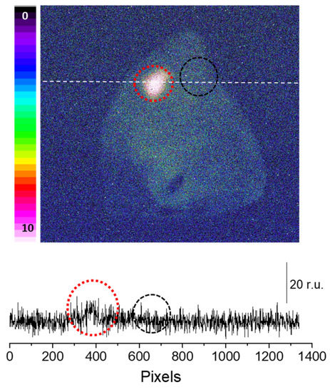 Fenton reagent-induced two-dimensional ultra-weak photon emission imaging from porcine ear measured after the topical application of Fenton reagent (10 mM H2O2/250 µM FeSO4) in the presence of interference filter type 644 (340–540 nm). The circle indicates the untreated (red) and treated (black) areas of the porcine skin with sodium ascorbate. Other experimental conditions as described in Figure 3. The Y-axis in the lower panel reflects the number of photon counts accumulated after 30 min, whereas the X-axis denotes the pixel of the image.