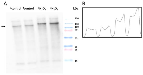 (A) Identification of MDA-protein adducts in homogenates of porcine skin cells. Lanes 1–2 show control samples, while lanes 3–4 are skin samples treated with H2O2 (10 mM) (B). Quantification of protein bands (by densitogram analysis) from an anti-MDA blot is presented, and proteins of interest are indicated by arrows.