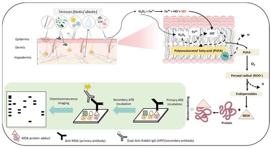 Schematic representation depicting the steps involved in the formation of the MDA-protein adduct as the consequence of ROS generation and successive oxidative radical reactions. The figures show stress factors (biotic and abiotic) that can lead to the formation of ROS which eventually can lead to lipid peroxidation and subsequently to the generation of the MDA-protein adduct. The lower panel depicts the use of immunoblotting techniques to detect MDA- protein formation.