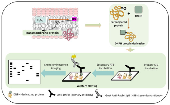 To monitor the protein carbonyl formation, derivatization was conducted, as mentioned in Section 3.4. The western blot analysis of the control and H2O2-treated skin biopsies displayed protein carbonyl levels, as measured by the anti-DNP antibodies (Figure 6A). A distinct band at 130 kDa was observed in both groups with varied patterns. It is clear that the carbonylated proteins isolated from the control groups are significantly less formed than the treatment groups. Figure 7 and Figure 8 (created with elements from BioRender.com) show the steps involved in the formation of the MDA-protein adduct and protein carbonyl formation, respectively. Differences between the control and treatment groups are presented as a separate densitogram (Figure 6B). Additional studies targeting the identification and characterization of selected proteins from both anti-MDA and anti-DNP blots are under study.
