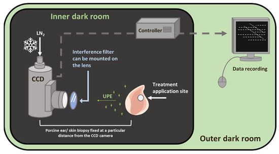 Two-dimensional photon emission imaging was measured in porcine ear/skin biopsies utilizing a sensitive CCD camera. The skin samples were dark-adapted for 30 min to eradicate any interference by delayed luminescence and treated afterward. The other experimental conditions are as per the procedure described in the listed reference [27]. The VersArray 1300B CCD camera (Princeton Instruments, Trenton, NJ, USA) with a spectral sensitivity of 350–1000 nm and ~90% quantum efficiency was used under the following parameters: scan rate, 100 kHz; gain, 2; accumulation time, 30 min (porcine ear/skin biopsies). The CCD camera was cooled to −108 °C using a liquid nitrogen cooling system, which helps to reduce the dark current. Before each measurement, the data correction was made by subtracting the background noise from the experimental dataset.