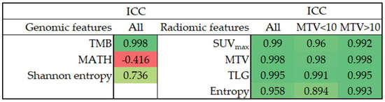 Baseline patient characteristics were presented as proportions, frequencies, means or medians, as appropriate. We analyzed the reliability of WES-based genomic and 18F-FDG PET-derived radiomic features using ICC. Our ICC used a two-way random model, a single measurement type, to report the consistency of each radiogenomic feature. An ICC value less than 0.5 suggests poor reliability, a value between 0.5 and 0.75 means moderate reliability, a value between 0.75 and 0.9 indicates good reliability and a value greater than 0.9 indicates excellent reliability [53].