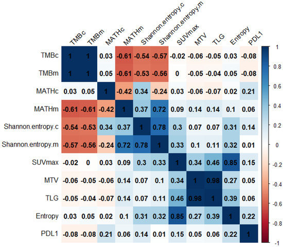 The correlation matrix of radiogenomic features. Values are Pearson’s correlation coefficients. TMB, tumor mutation burden; MATH, mutant-allele tumor heterogeneity; SUV, standardized uptake value; MTV, metabolic tumor volume; TLG, total lesion glycolysis; PDL1, programmed cell death ligand 1 expression level.