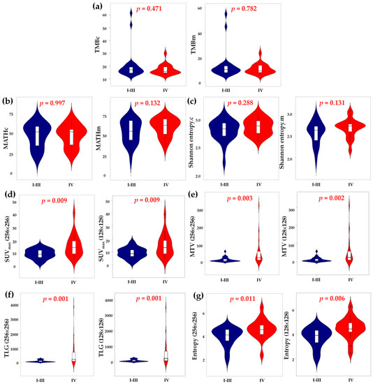 Comparing the TMB (a), MATH (b), Shannon entropy (c), SUVmax (d), MTV (e), TLG (f) and entropy (g) between patients with cancer stages of I to III and IV. TMB, tumor mutation burden; MATH, mutant-allele tumor heterogeneity; SUV, standardized uptake value; MTV, metabolic tumor volume; TLG, total lesion glycolysis.
