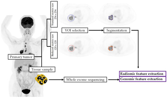 Therefore, this prospective study aimed to investigate and compare the reliability of two commonly used genomic heterogeneity features (MATH and Shannon entropy) using different PAF cutoffs. We also analyzed the reliability of digitalized 18F-FDG PET-derived radiomics in different image matrix sizes. Finally, we correlated the genomic and radiomic biomarkers with clinical data from patients with NSCLC.